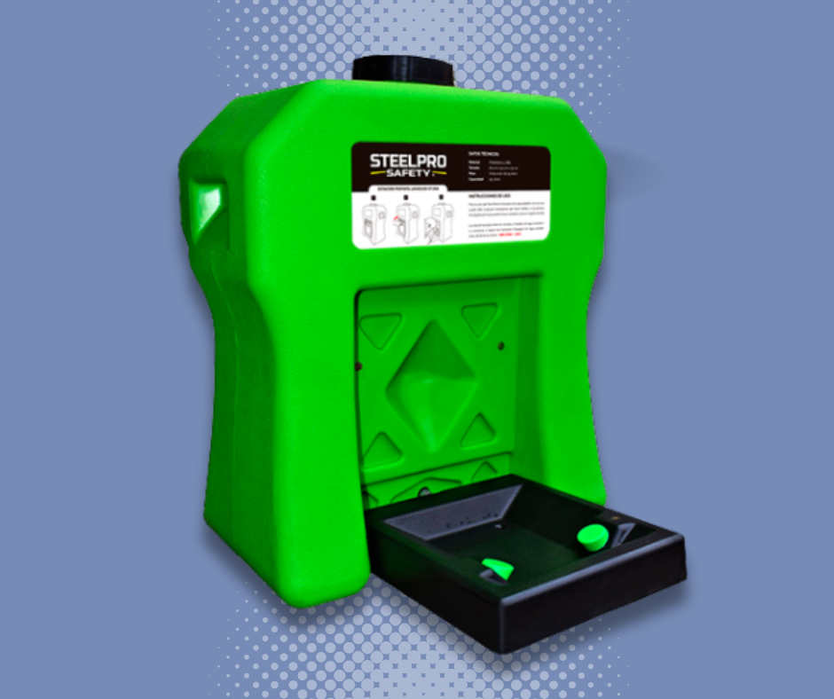 La Estación Portátil Lavaojos STEELPRO es un equipo diseñado para emergencias de salpicadura de agentes que puedan afectar la cara y ojos, con una compuerta fácil de accionar y fabricada en polietileno y ABS (Acrilonitrilo Butadieno Estireno) de color verde garantiza el tiempo y uso en lugares de poco acceso al agua potable.